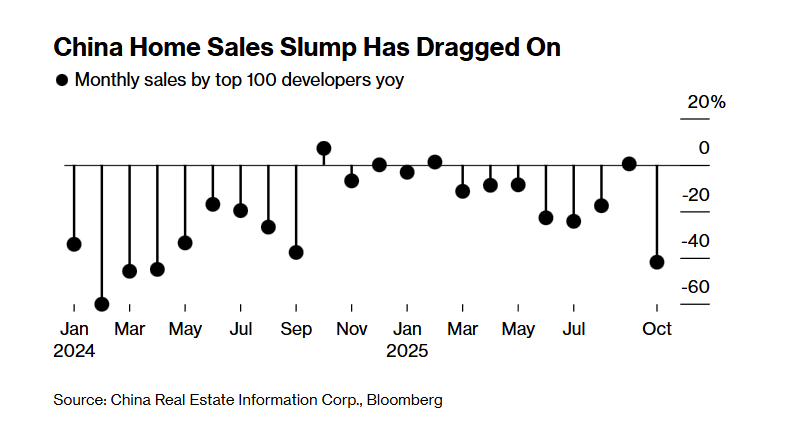 彭博根据中国房地产信息集团数据计算显示,10月全国百强房企新房销售同比大跌41.9%,为18个月来最大月度跌幅。由于去年同期在政府刺激措施推动下形成高基数,11月的数据尤为引人关注。